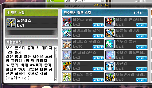 - 중첩되는 직업군 플레이시 12칸중에 하나를 소모하지 않고 왼쪽의 자기 링크스킬 칸에 중첩됨 (예: 보우마스터에게 신궁 링크스킬을 전수해주는 경우)