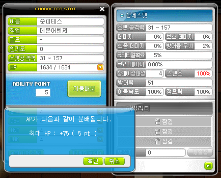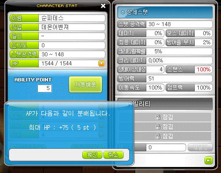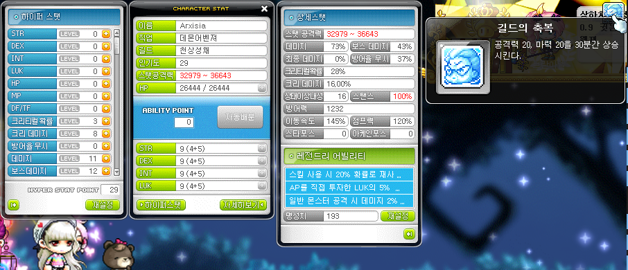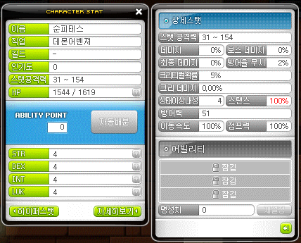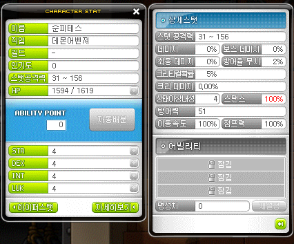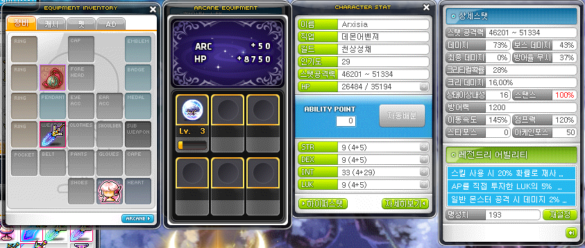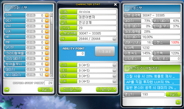 - 뎀퍼 73% = 40%(4차기본) + 33%(하이퍼스탯 11렙)