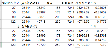 힘 늘어난만큼 비례상수에 더했더니 오차 1 이내로 일치함