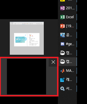 이 경우에 창이 어디있는지도 모르겠고 마우스로 모서리 아무리 찍어봐도 나오질 않는다. 작업표시줄에서 해당 창에 마우스를 올려보면 아래 사진처럼 까맣게 된게 보이는데 눌러봐도 뜨지 않는다. 아예 화면에서 사라져버린 것이다.