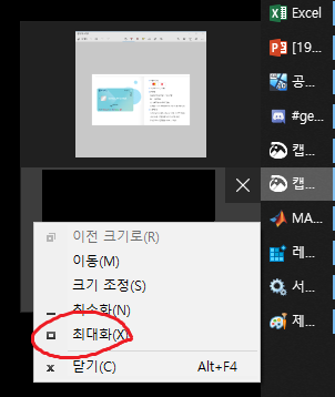 만약 저 창이 안뜨는 경우라면 해당 창을 활성화시킨 후에 Alt + Space + X를 누르면 역시 최대화가 된다.
