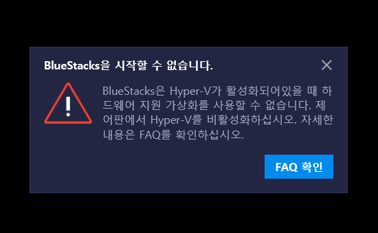최근 윈도우 인사이더 프리뷰 19564 업데이트 이후로 블루스택을 켜면 아래와 같이 hyper-V 관련 오류가 뜨면서 안켜졌다. 이전에는 hyper-V로 별짓 다해봤지만 마지막 클린설치 이후에는 하이퍼V를 켠적도 없는데 원래 되던 블루스택이 안되는 현상이 이해가 안됐다.