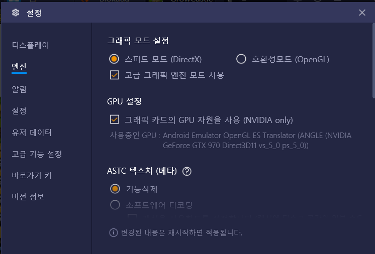 이렇게 하니까 아주 정상적으로 잘 되고, 느린 현상도 완전히 사라졌다. 참고로 블루스택 설정에서 그래픽부분은 아래 그림과 같이 directX로 변경하였다.