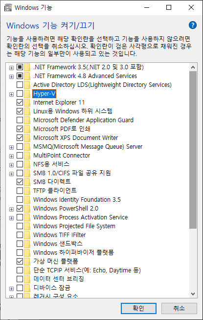 실제로 windows 기능 켜기 끄기를 들어가도 아래와 같이 hyper V는 꺼져 있다. 참고로 나는 oracle virtualbox를 사용중이다.