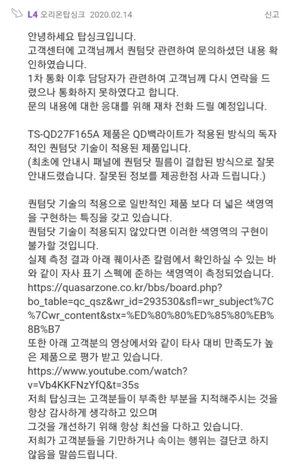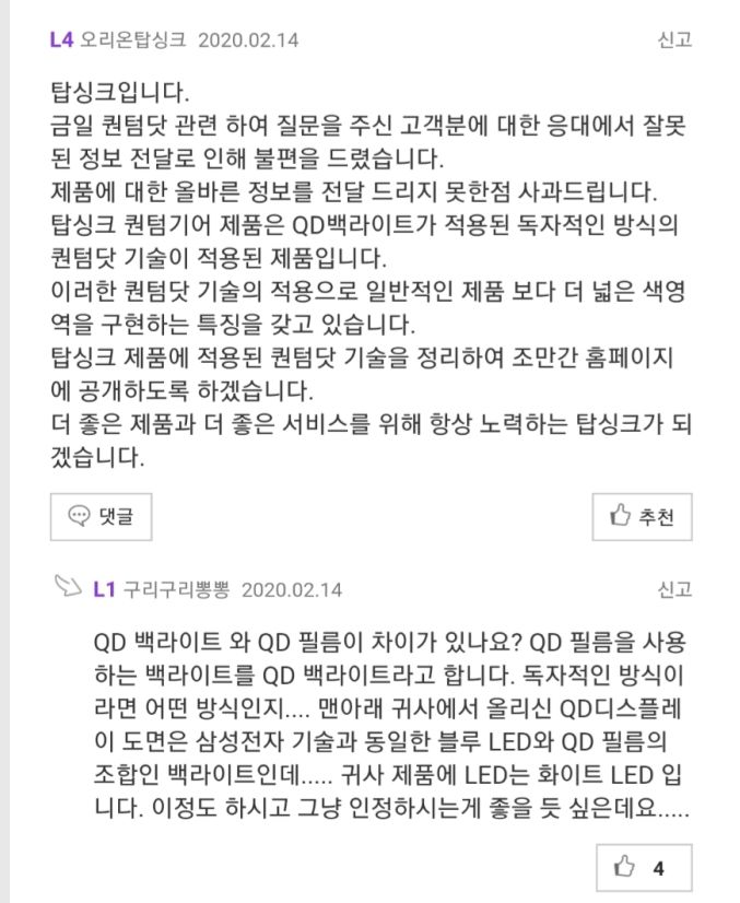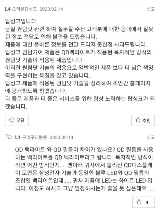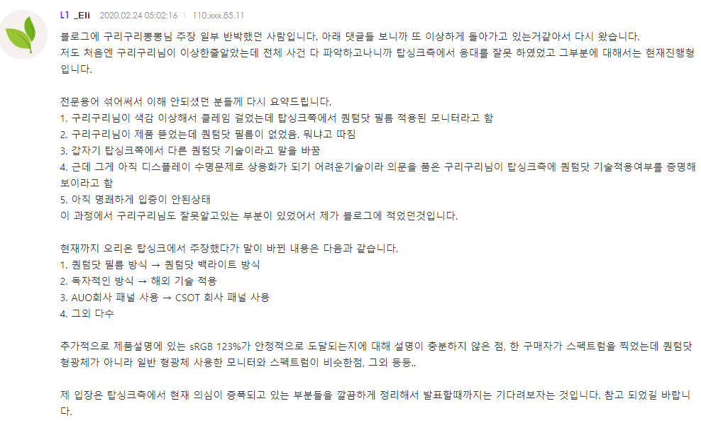여기에서도 탑싱크 관계자는 최대한 친절하게 대응하려고 노력하는 것을 알 수 있었다. 구리구리는 아직도 퀀텀닷 모니터인지에 대해 의문을 제기하고 있었다.