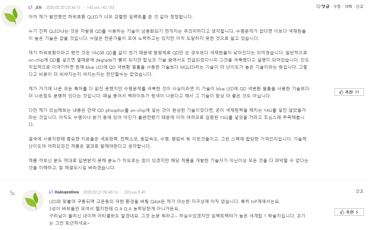 내가 회사 하나를 작살낸게 아닌가? 하는 생각도 들었다. 사실 색좌표문제도 삼성방식에 비해 안좋다뿐이지 종래 LCD보다는 좋은게 확실한데말이다. 근데 이건 QD 죽기 전까지만... 만약 수명문제를 개선한게 맞다면 오히려 더 진보된 기술인 것이다 (이거를 QD필름으로 썼더라면 더 좋았을지도?). 이런 걱정을 하고 있는 와중에 몇몇 커뮤니티에 지나가는 전문가 라는 수식어와 함께 내 글이 박제되기에 이르렀다.