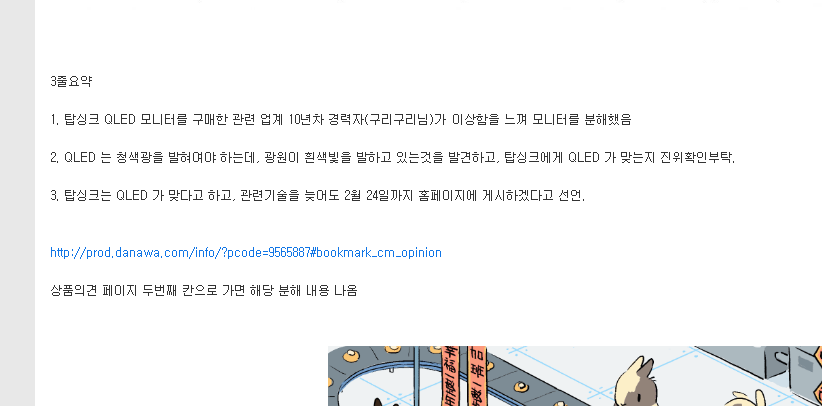 이부분의 QD 백라이트에 대한 레퍼런스를 찾고싶었는데 배틀페이지 글에는 관련 내용이 없었고 다나와 제품 페이지에는 댓글이 벌써 10페이지가 넘어가서 막막한 상황. 이때 지인1이 다른 링크를 보내줬다.
