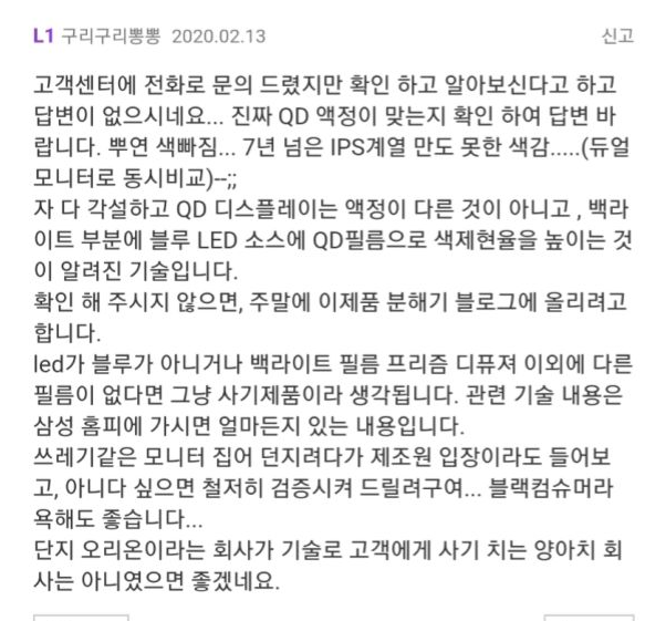 대충 슥 훑어보니까 고객 한명이 디스플레이 샀다가 클레임을 넣었는데 답변이 만족스럽지 않자 아예 제품을 분해해서 구성요소를 봐버린 것이었다. 아까의 배틀페이지 글에서 확인은 안되지만 10년 경력자라고 언급이 되어있어서 그걸 감안하고 보니까 도광판 프리즘 이런 단어들이 나오는걸로 봐서 문외한은 아닌것 같았다.