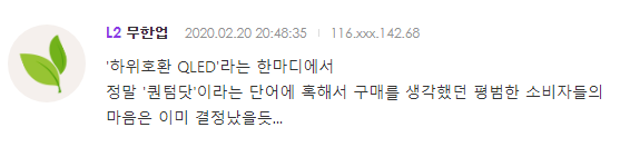 그와중에 한성컴퓨터가 물들어올때 노젓고 있는 글을 발견했다. '이것이 진짜 퀀텀닷이다' 등의 문구는 싹 뺀걸보면 한성에서 올린 글이 치밀하게 설계된 마케팅이라는 생각이 들었다. 그런데 댓글을 보니 이게 퀀텀닷이지 뭐 그런 느낌이었다. 아까 위에도 말했지만 내생각은 자발광 QD가 아니면 QLED로 인정하지 않는다. 현재로서는 QLED를 지향하는 다양한 QD 형광체 방식 (제대로 뜯어보면 결국은 LCD 디스플레이 기술임) 이 있을 뿐. 사람들이 이것만 보고 탑싱크 버리고 한성껄로 갈아타는것도 옳지 않다고 생각했다. (물론 제대로 검증해봤을때 객관적으로 한성께 더 우수하다면 모르겠지만 말이다.)