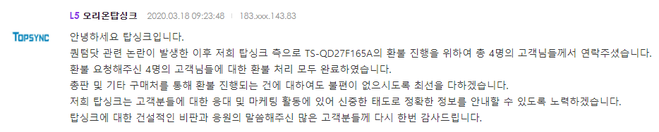 그리고 또 하나의 큰 문제는 나도 이번에 처음 겪어봤는데 인터넷상에는 분탕러가 큰 영향을 미친다는 것이다. 현실에서 분탕러가 나오면 쫓아버리면 된다. 그런데 인터넷상에서는 쫓아내기가 매우 어렵다. 비록 소수지만 이 사람들 때문에 정상적인 논의를 이어가는데 방해가 되고, 감정적으로 고조되다보면 상대방을 설득하는 것이 아니라 공격하게 된다. 이런 사람들이 하도 날뛰다보니 구리구리님도 본인과 다른 의견이 나오면 탑싱크 관계자로 몰아가고, 탑싱크 쪽에서도 정신줄을 놨는지 댓글 쓰는 사람들을 공격하다가 갑자기 역시 디스플레이는 LG입니다 이러고있고..... 하여튼 나는 이러한 현상이 지속되는걸 보기가 정말 힘들었고, 본업도 있지만 틈틈이 와서 막으려는 시도도 했었다. 그 과정에서 미쳐돌아가는 여론을 의식했는지 나로서는 예상치 못했던 기존 구매자에 대해 품질 평생보증이라는 카드를 들고 나오기도 했다. 이런저런 일이 많았지만 현재에는 어느 정도 정리가 된 느낌이다.