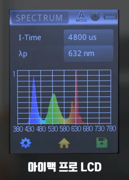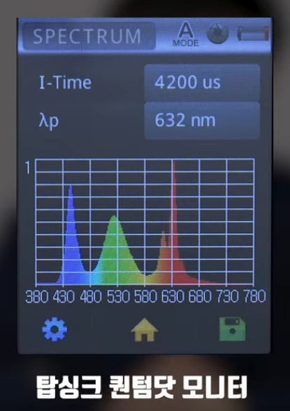 이 중 파란색 부분은 일반 무기물 LED에서 나오는 빛이고, 초록색과 빨간색은 파란빛을 흡수한 형광체가 내는 빛이다. QLED TV의 경우 퀀텀닷이 적용되어 있고 초록색과 빨간색에서 피크가 하나인 부드러운 곡선모양을 띈다. 이러한 곡선은 발광 물질의 고유특성이기 때문에 스펙트럼만 보고도 대략 어떤 물질이 포함되어있는지 유추해 볼 수 있다. 중요하게 볼 부분은 색깔별 피크 파장과 옆으로 퍼지는 정도이다.