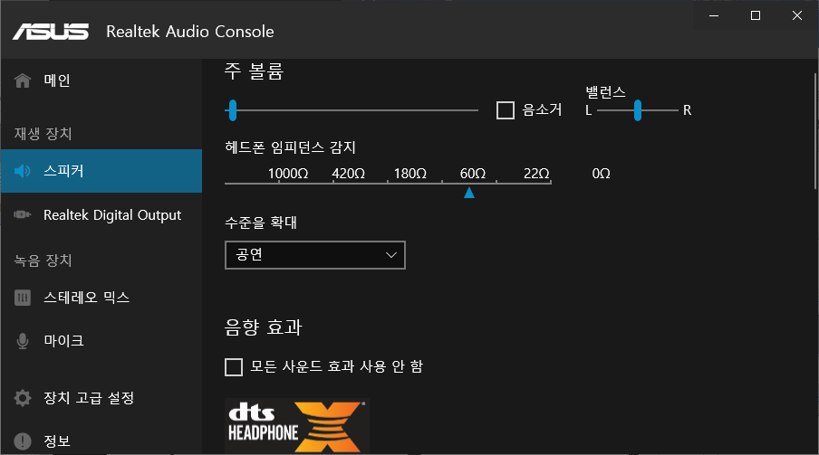 어쨌거나 또 다른 기기인 연구실 컴퓨터에도 꽂아보았다. 연구실 컴퓨터의 사운드카드에서는 임피던스 감지 기능을 지원하고 있고, 다음과 같이 숫자로 표시도 해 준다. 역시 킹수스.