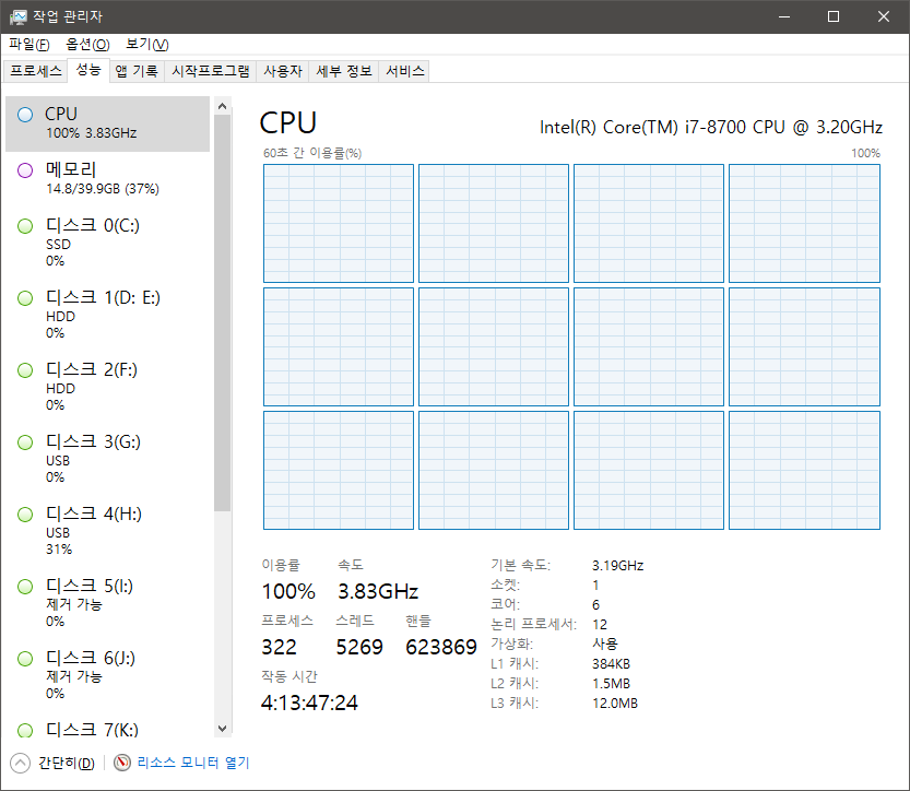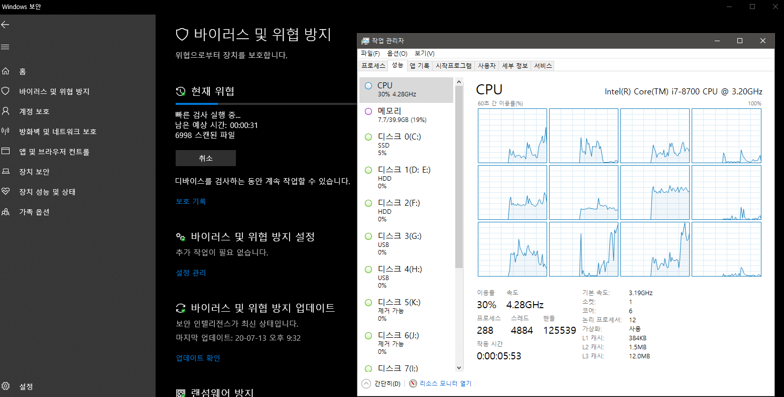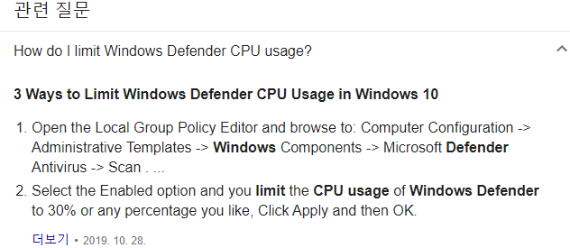 간만에 바이러스 검사를 돌렸더니 윈도우 디펜더가 위와 같이 CPU 올코어 100%를 점유한다. 그래서 동시에 다른 작업을 할 수가 없었다. 이전에는 바이러스 검사 돌리면서 일반 서류작업은 충분히 할 수 있었는데 언제부터 바뀐건지 cpu 100퍼를 찍어서 마우스 움직이는데도 버벅거릴 정도다. 바이러스 검사속도를 희생하더라도 해야할 일이 있는데 손 놓고있을 수는 없는 상황.