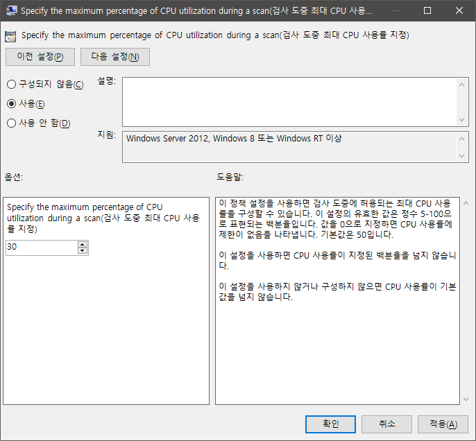 specify 어쩌고 하는 CPU 항목을 우클릭해서 다음과 같이 사용으로 바꿔 준 후 왼쪽아래 옵션에서 원하는 퍼센트로 지정하면 된다. 내 경험상 cpu가 40%넘으면 컴퓨터가 렉걸리면서 작업이 버벅거리는 경향이 있고 30%정도면 괜찮았어서 30으로 넣었다.