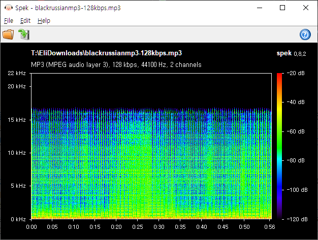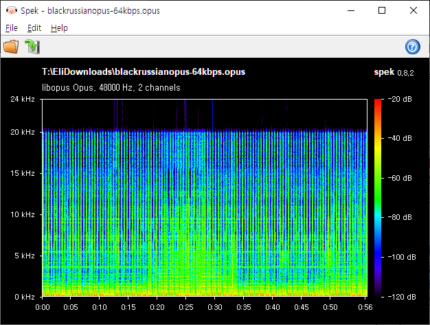 참고적으로 Spek이란 프로그램을 이용하면 해당 파일의 주파수가 어디서 짤리는지 간단하게 확인할 수 있다. 다음은 내가 구글 클라우드에서 다운받은 64kbps Opus 파일과 128kbps mp3파일을 열어본 화면이다.