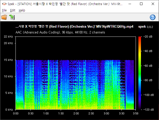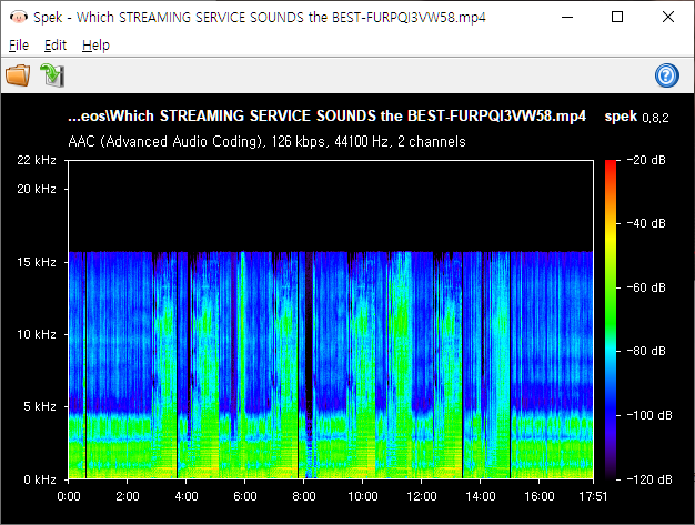 그 동안 알고 있던 유튜브의 소리 특성이 맞는지 확인을 위해 음질에 매우 신경쓰는 사람의 유튜브 영상을 spek 프로그램으로 열어 보았다. 역시 15.8kHz에서 짤리는 것을 확인할 수 있다. 참고로 글 쓰는 시점에 SM에서 나온 최신 영상도 해 보았는데 이건 오히려 더 낮은 15kHz에서 짤리는 것도 확인할 수 있었다.