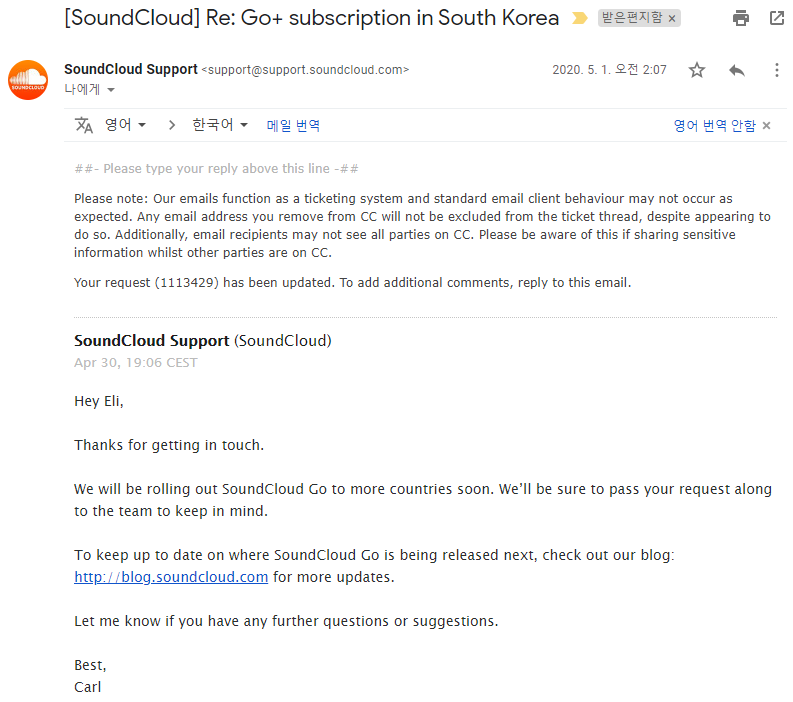 내용을 요약하면 자기네 블로그를 보라는 매크로 답변인데 블로그에 들어가도 별다른 정보를 찾을 수가 없었다. 그냥 우리나라 출시에는 관심이 없는 것 같았다. 즉 현재 상태로는 돈을 내고 고품질 음원을 들을 수 있는 방법이 사운드클라우드엔 없다고 보는 게 맞다.