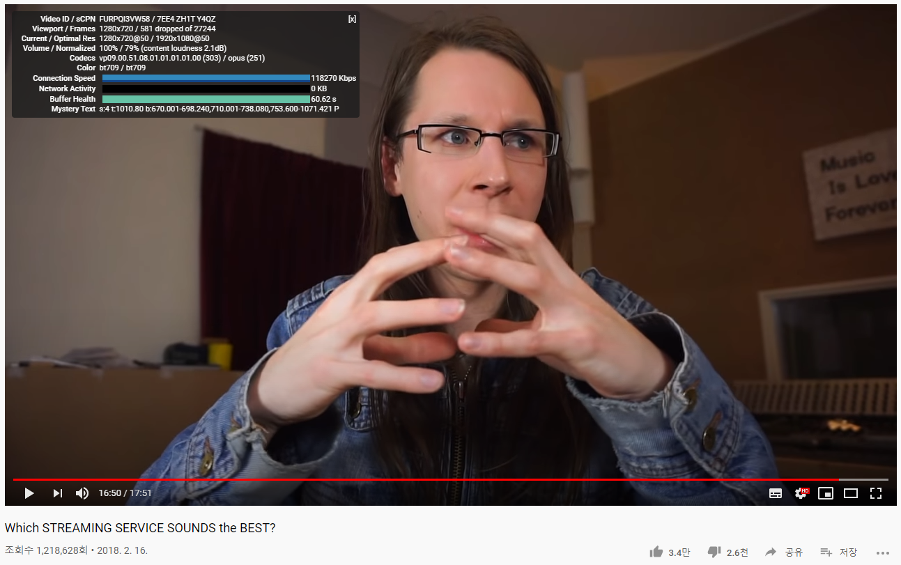 A6. 아직 완전하게 정보를 모으지 못했지만 유튜브는 몇 년 사이에 오디오 코덱이 자주 바뀌었던 것 같고, 현재는 webm 컨테이너에 오디오 코덱은 Opus를 쓰고 있다. 일반 코덱들에 비해 차이는 주파수를 15.8kHz 또는 15kHz에서 짤라버린다는 점이다. 유튜브 프리미엄이나 유튜브 뮤직은 어떨지 모르겠지만 그냥 들을때는 음질 안좋다 생각하면서 듣는게 맞을 것 같다.