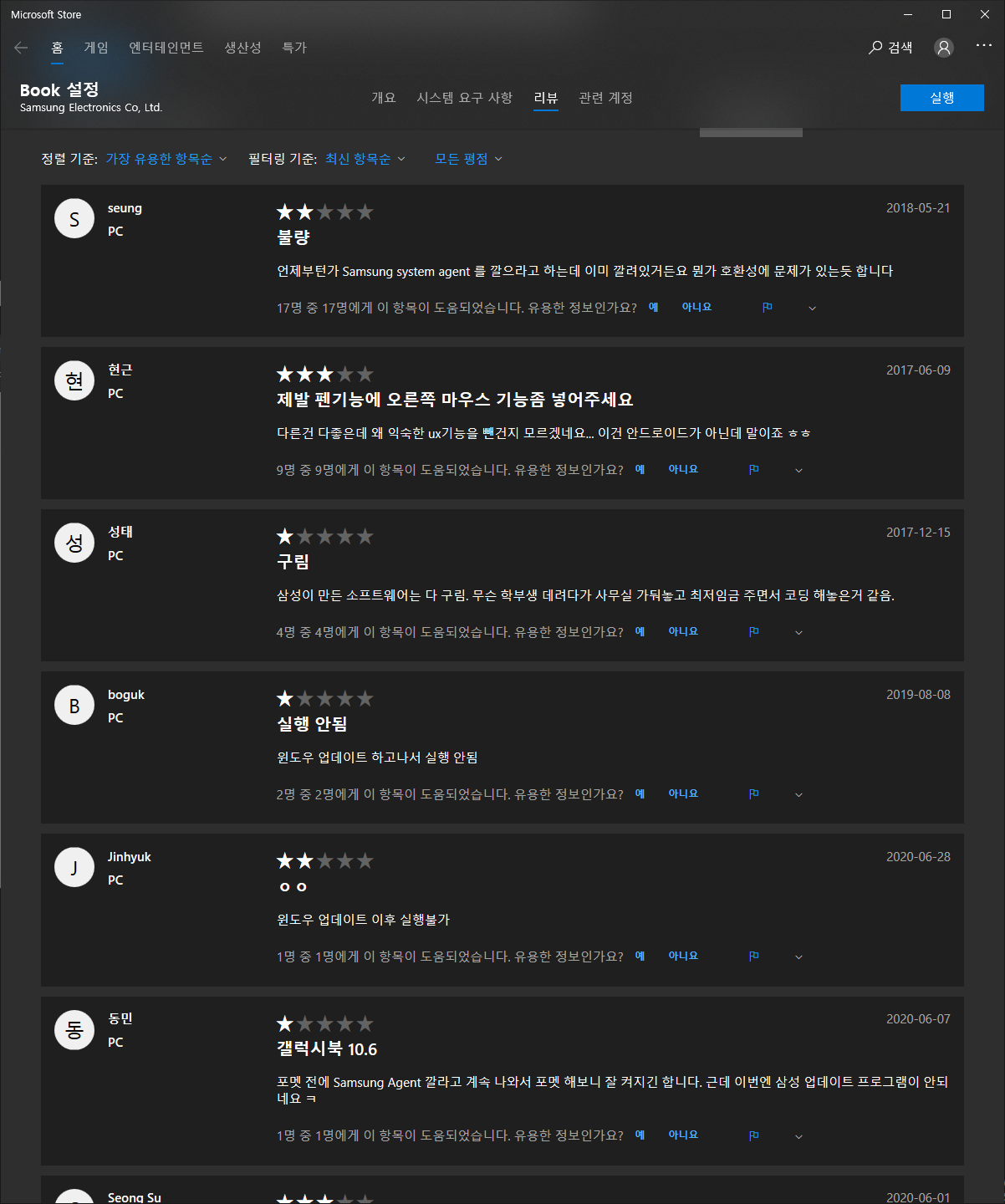 이것저것 재설치를 눌러보다가 MS 스토어 book 설정 앱 리뷰에서 나랑 똑같은 현상을 발견했다.