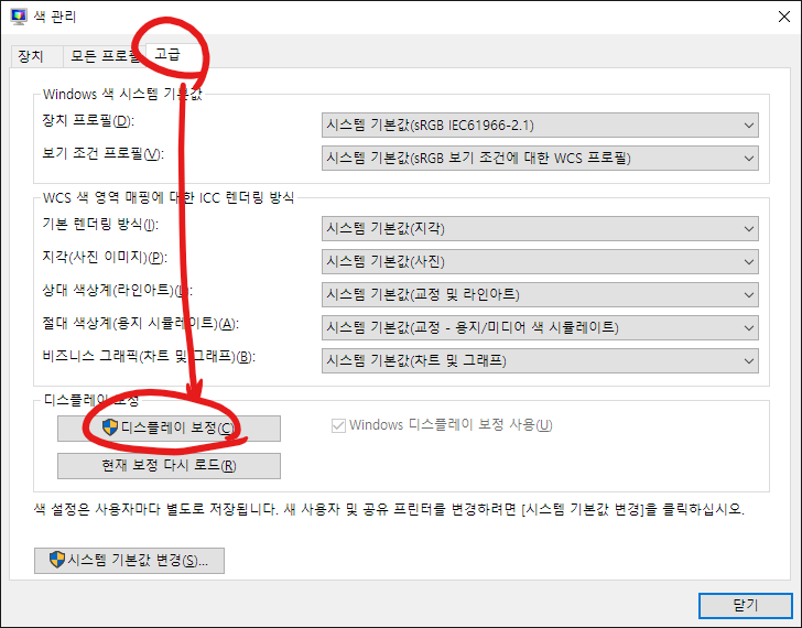 마지막으로 고급 탭 - 디스플레이 보정을 누르면 된다. 윈도우도 애플 따라가려고 하나... 왜이리 고급의 고급같은 데에다가 이런걸 숨겨놓는지 모르겠다. 아래 사진은 내가 보정한 이후의 캡처라 몇가지 옵션이 더 생겨있다.