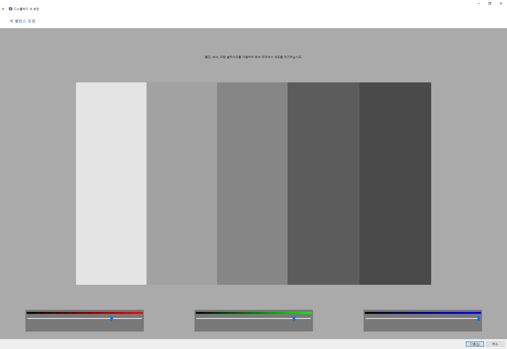처음엔 감마를 보정하고 (참고로 sRGB 색공간의 감마 표준값은 2.2이다), 대비는 사용자가 어떻게 조정하기 어려우니 건너뛰고 진행을 하다보면 아래와 같은 창이 나온다. 화면이 노랗기 때문에 아래와 같이 빨강과 초록을 줄여주었다.