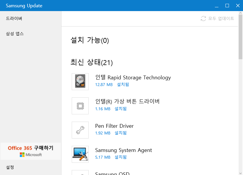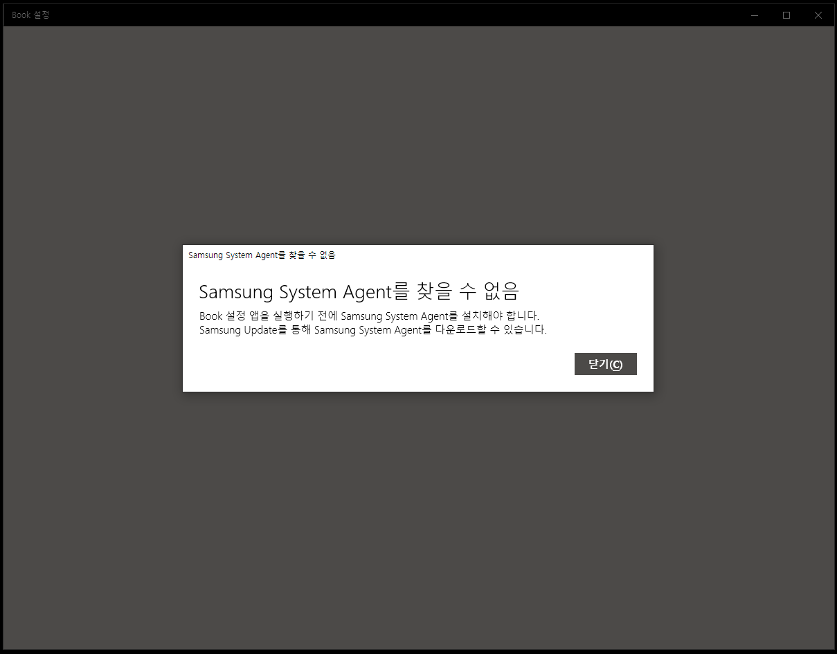 위와 같은 에러가 나면서 안켜졌다. 삼성 업데이트 앱에 가면 다음과 같이 삼성 시스템 에이전트 앱이 이미 깔려있는데도 안됐다.