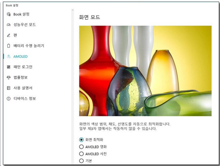 하여간 최근에 논문에 들어갈 그림을 그리는데 어쩔 수 없이 이 갤럭시북으로 작업해야 하는 경우가 되었다. 그런데 그림을 그리려고 보니까 흰색이 내가 아는 흰색이 아니고 노랑이 많이 껴있는 색이 나왔다. 야간모드가 켜있는게 아닌데도 그랬다. 수명때문에 blue가 죽었다기에는 아무리 생각해도 위의 사진에 있는 색깔 profile문제일 것 같아 book 설정 앱을 켰다. 그런데 이게 웬일인가?