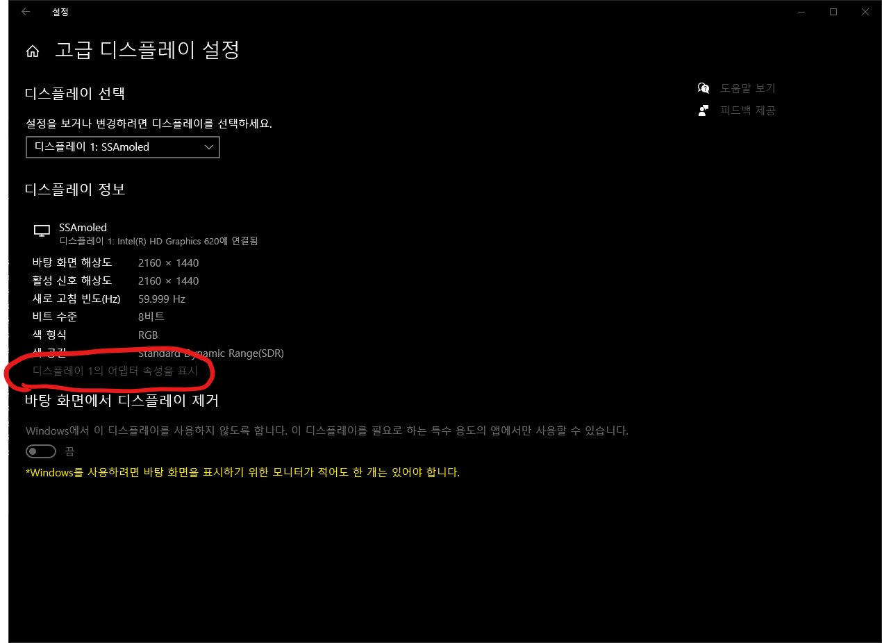 디스플레이 1의 어댑터 속성 표시 클릭