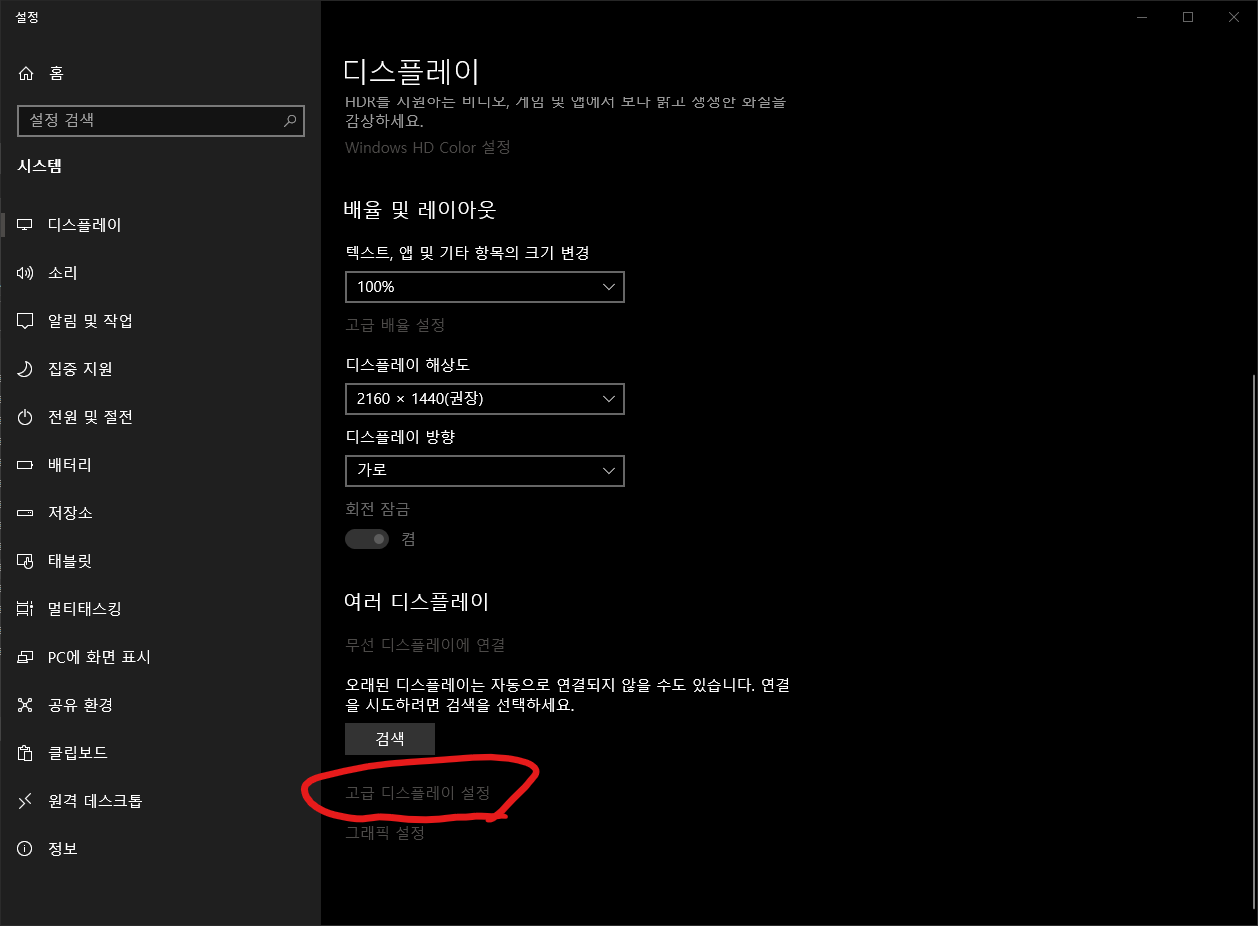 스크롤 내려서 고급 디스플레이 설정