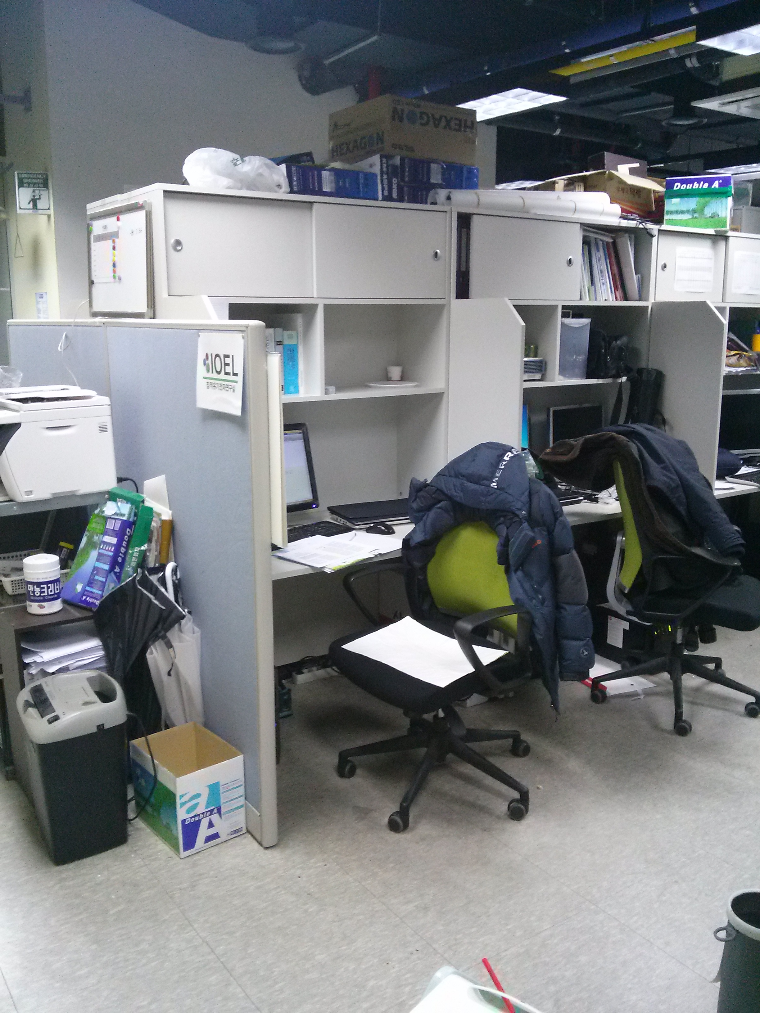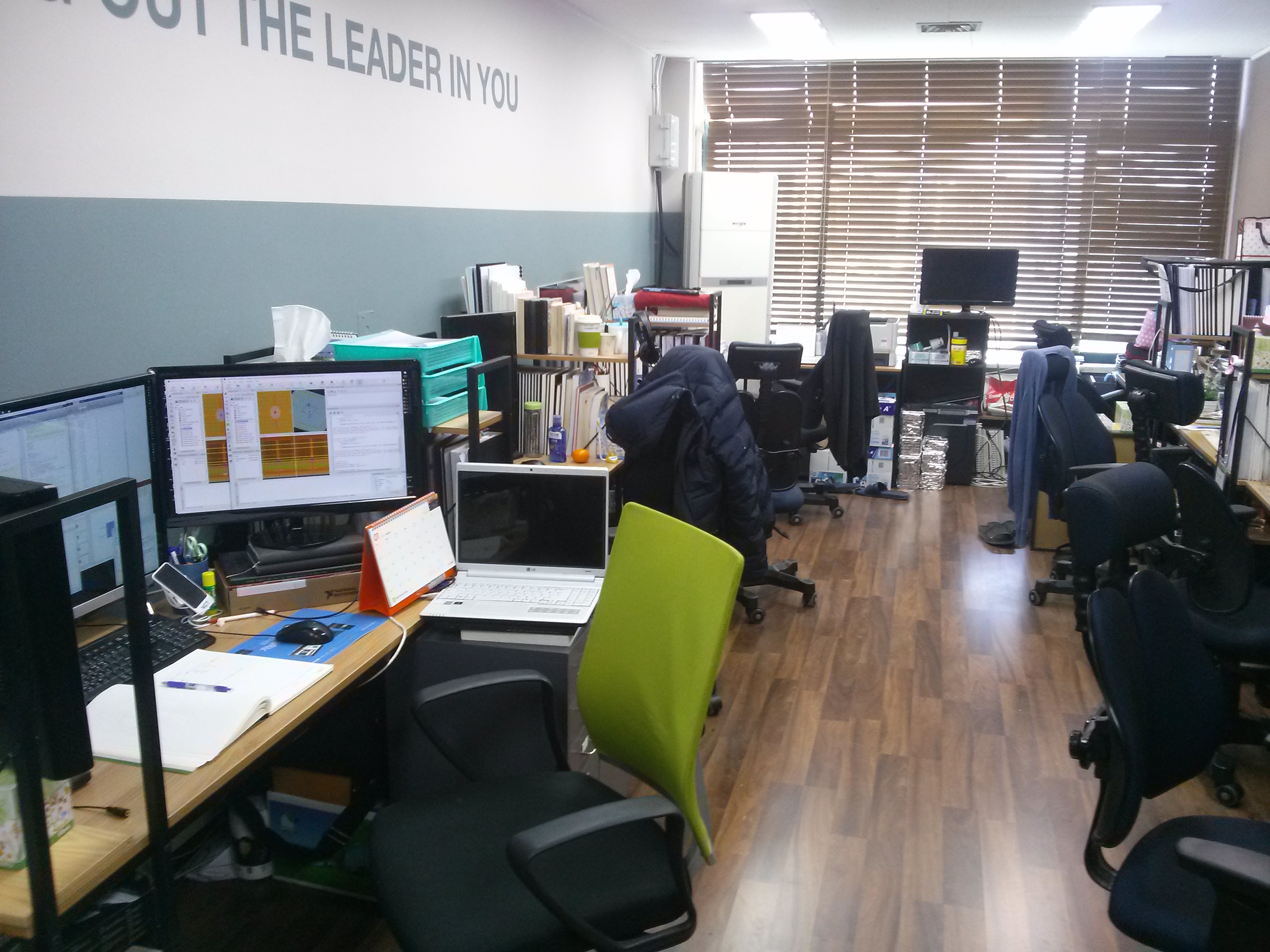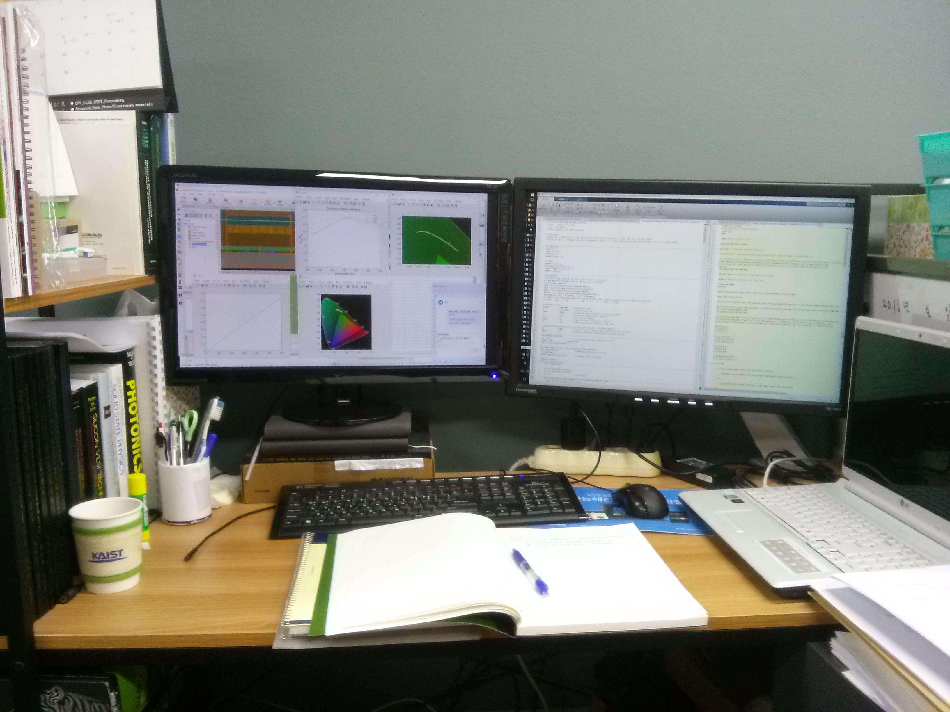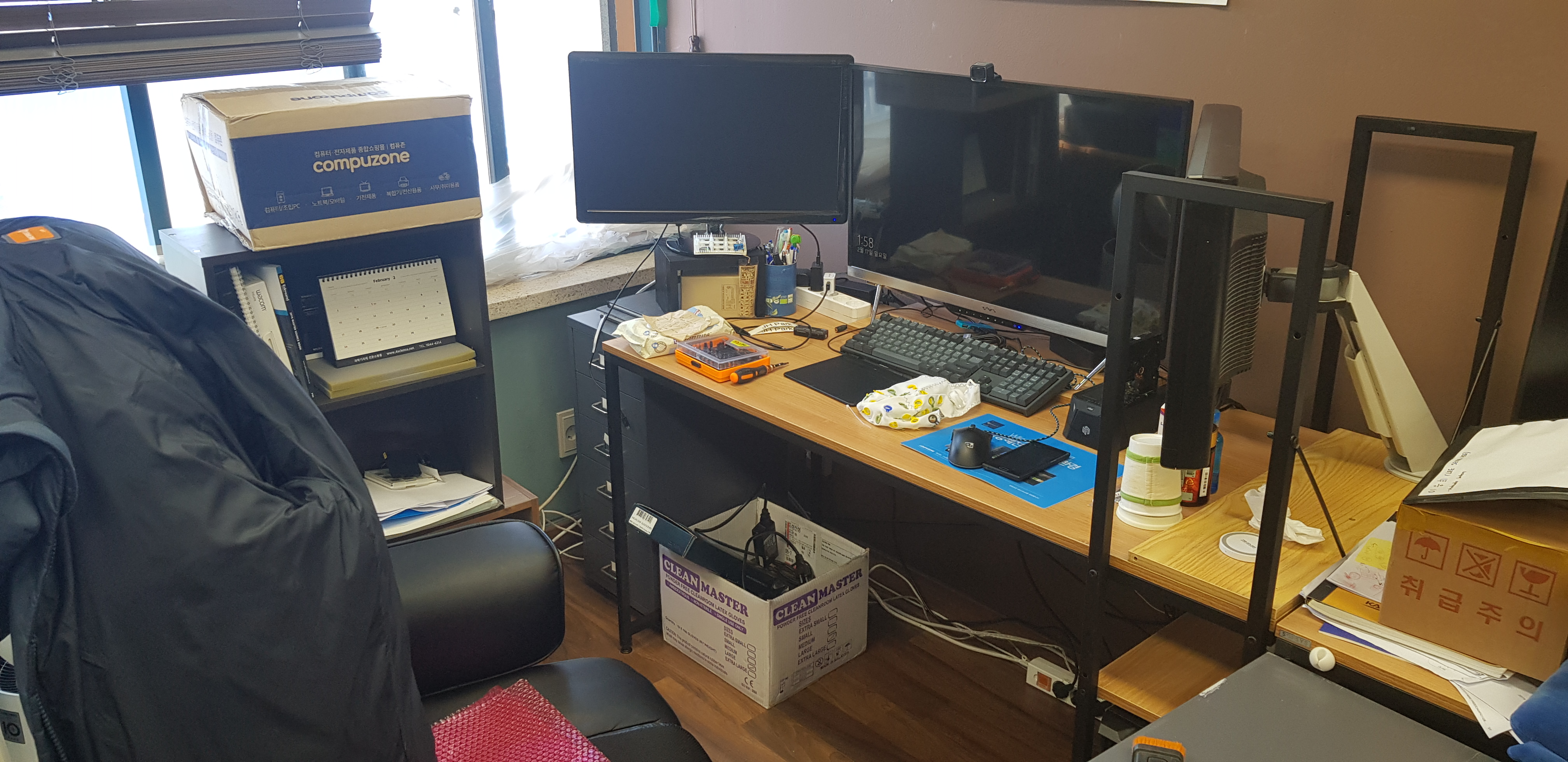 시간이 흘러흘러 석사학위도 따고 박사과정 연차도 올라감에 따라 더욱 깊은 창가 쪽 자리로 옮기게 되었는데 오른쪽 벽을 바라보게 되었기 때문에 책상의 좌우를 바꾸는 과정에서 왼쪽 모니터는 오른쪽으로, 오른쪽 모니터는 왼쪽으로 옮겼다.