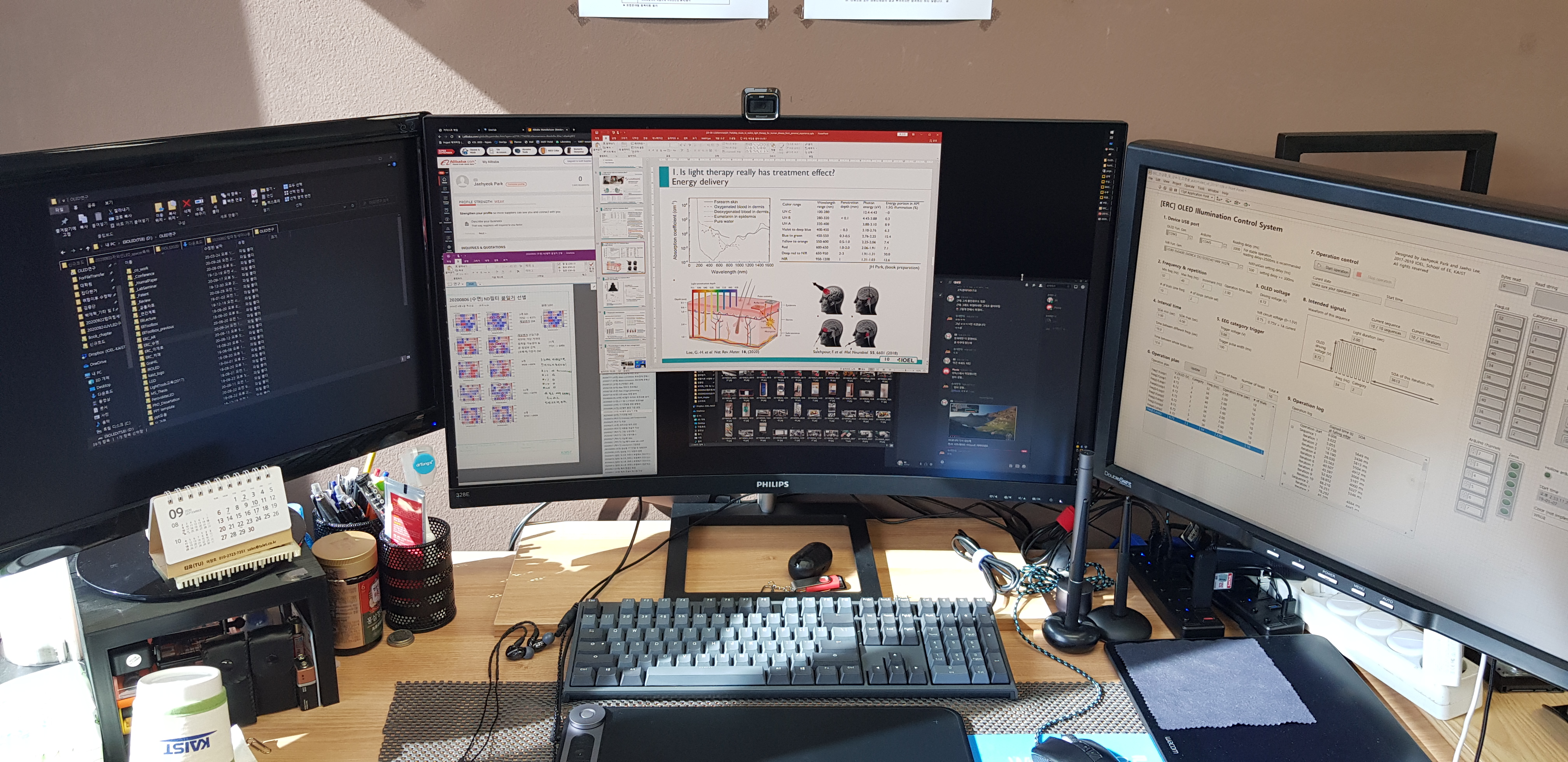 당시에는 OLED를 시뮬레이션하기 위해 열심히 이론을 공부하고 MATLAB으로 시뮬레이션 프로그램을 만들어보고 있었는데 듀얼모니터가 되니 한쪽에는 코드 편집기, 한쪽에는 자료를 띄울 수 있어 훨씬 편리해졌다. 다만 책상 특성상 모니터 주고간 선배가 쓰던 모니터암을 달 수가 없어서 책상 모서리에 대충 얹어 놓고 사용했다. 연구를 하다 보니 나는 크롬 탭도 수십개 띄우고 MATLAB 편집기 탭도 수십 개 띄운다는 사실을 알아차렸다. 거기다가 논문 pdf도 탭이 십수 개, 파일탐색기 폴더 창도 몇 개씩 띄우다 보니 여러모로 모니터가 부족함을 느꼈다. 그러나 모니터를 새로 사도 책상에 놓을 수가 없었고, 아쉬운 대로 그대로 쓰기로 했다.
