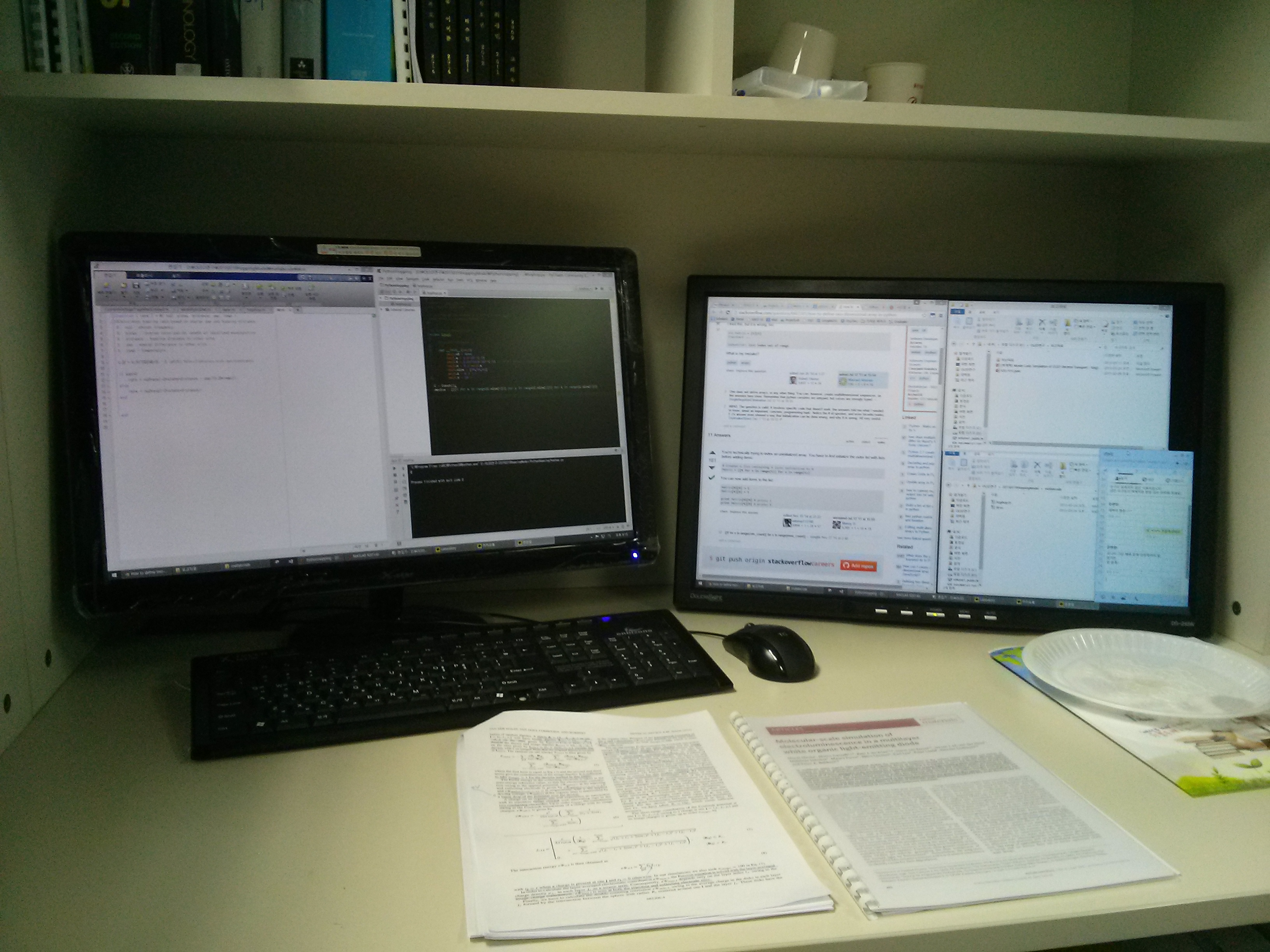 2015년 초, 대학원에 처음 입학하고 나서 들뜬 마음으로 연구실에 출근했으나 지원받은 컴퓨터는 최소 4~5년 된 본체와 연구실 컴퓨터 담당 선배가 사놓은 23인치 모니터 한 대. 그전까지는 노트북으로 작업했었기 때문에 1개의 모니터로도 딱히 불편한 점을 느끼진 못했지만 주변 사람들은 다 2개 이상씩 사용하고 있었다. 선배들에게 물어보니 지원은 1개만 해주고 나머지는 알아서 사는거라고 했다. 그런데 마침 박사 따고 해외로 나가는 연구실 선배가 본인이 쓰던 24인치 모니터를 나에게 주고 갔다. 그래서 아래와 같이 듀얼모니터가 되었다.
