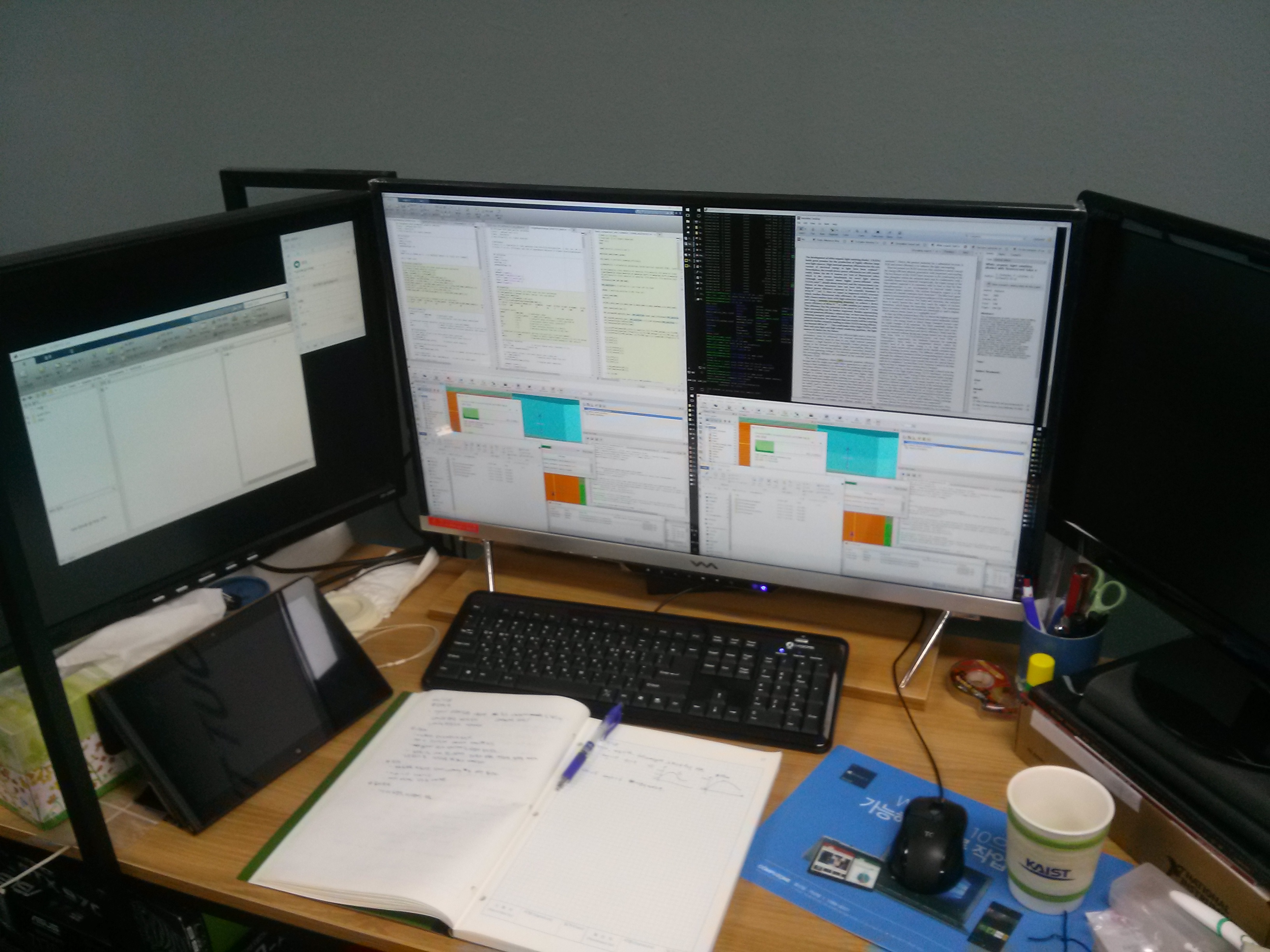 구성을 완성하고 보니 그 좁은 책상에 모니터를 우겨넣느라 왼쪽 모니터(선배한테 받았던거)는 45도보다 더 꺾어졌지만 어쨌거나 화면이 넓어서 그동안 답답했던 것들이 대부분 해소되고, 능률도 좋아졌다. 당시에는 인텔 i5 6700K를 사용하고 있었는데 처음 나올 당시 스타2 4K도 내장으로 돌아간다는걸 봤었어서 위의 구성도 내장그래픽으로 사용했다. 왼쪽 사진의 왼쪽 아래에 놓여있는 건 들고다니면서 필기할 때 쓰던 태블릿(레노버 TPT2)이다. 그리고 오른쪽 사진에도 나와 있지만 책상 서랍을 꺼내서 그 위에 기존에 쓰던 노트북을 올리고 은행결제 전용으로 사용했었다.