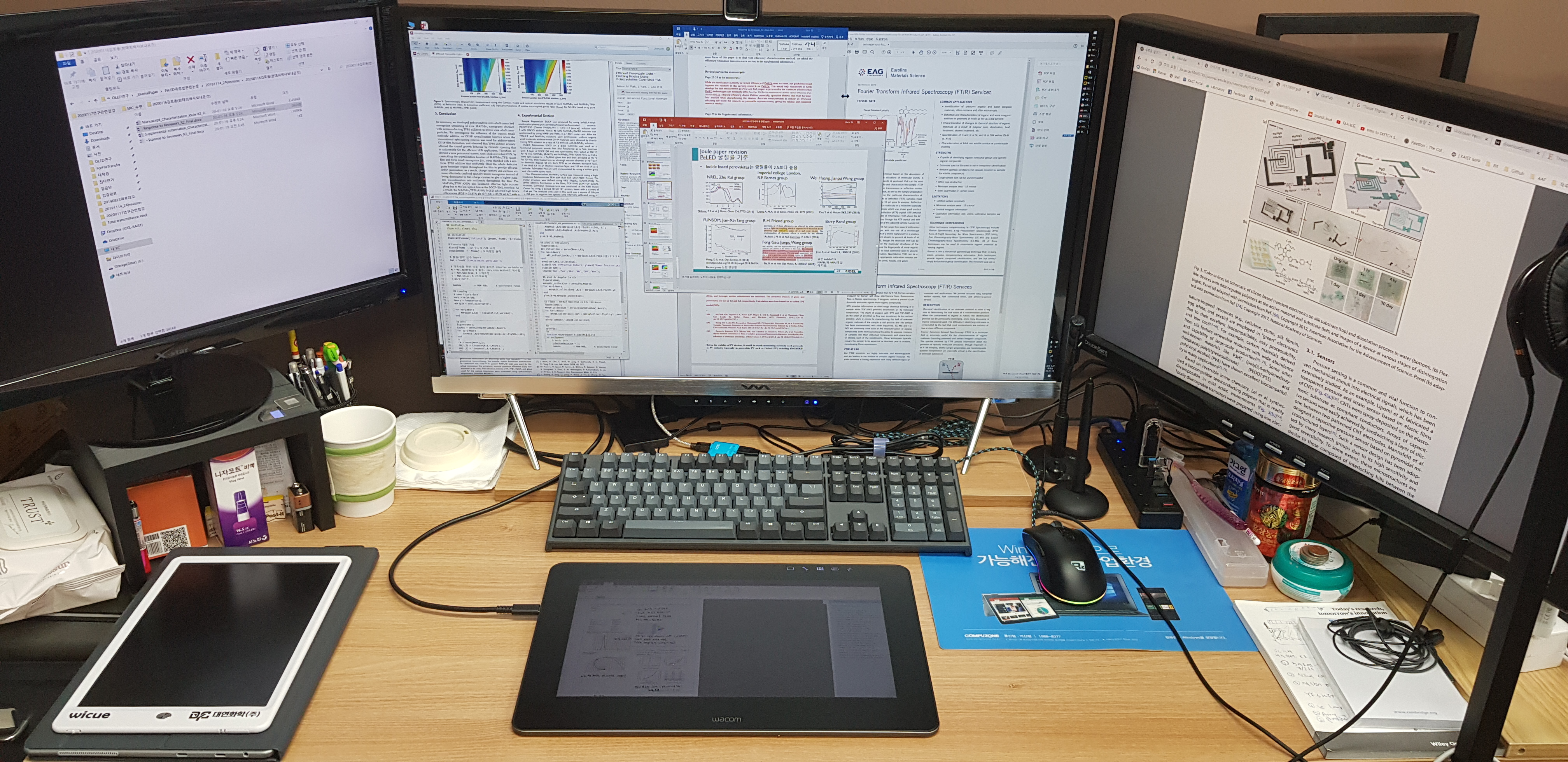 결과적으로 위 사진과 같이 아예 액정이 있고 터치도 되는 와콤 신티크 프로를 구매했다. 이후에 연구노트 작성이 매우 수월해졌고, 진정한 전자연구노트라는걸 맛볼 수 있었다. 다만 그래픽카드에서 나오는 포트가 3개뿐이라 구성당시 애를 많이 먹었다. 해당 내용은 여기 에서 확인할 수 있다.