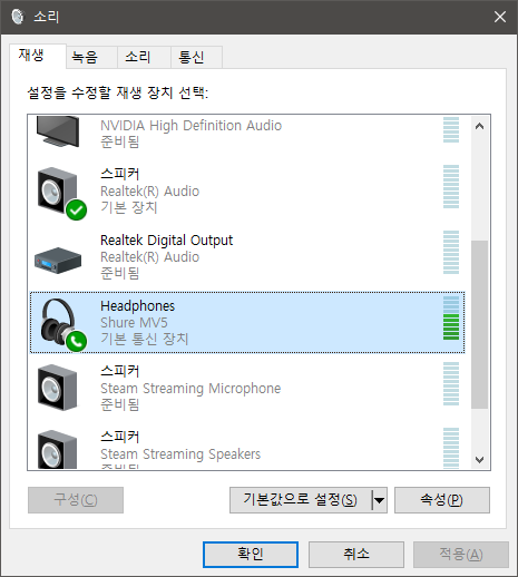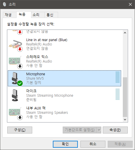 금요일에 주문해서 화요일에 올 것은 알았지만 하필 배송시간이 오후 4시~6시로 잡혀서 회의 시작시간인 4시에 맞추지 못할수도 있을 것 같다고 생각했다. 다행히도 3시 30분쯤에 확인을 하니 제품이 와 있어서 급하게 제품을 까고 막 꽂았다. USB를 꽂자마자 슈어 MV5라는 이름으로 바로 인식을 시작했고, 마이크로 잡혔다. 그리고 갑자기 소리가 전혀 안나왔다. 매우 당황스러웠는데 소리 탭에 들어가보니 다음과 같이 나타났다.