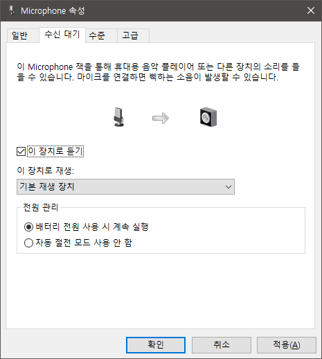 슈어 마이크를 기본 장치로 지정을 했고, 속성에 들어가니 이전에 봤던 구즈넥 마이크와는 다르게 증폭 옵션은 없었고 그냥 마이크 소리만 조정할 수 있었다. 일단 최대로 키우고 나서 마이크에 들어오는 소리를 듣기 위해 수신 대기 탭에서 아래와 같이 이 장치로 듣기를 활성화했다. 소리가 작긴 하지만 컴퓨터에 꽂은 이어폰으로 내 말소리를 들을 수 있었다.