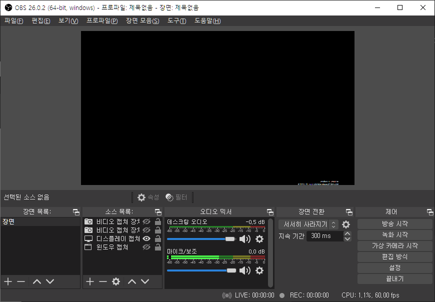 저걸로 잘만 하면 웹캠으로 인식시킬 수가 있는게 아닌가? 라고 생각이 들었다. 그래서 가상 카메라 시작을 누르고 소스에 비디오 캡쳐 장치로 웹캡을 넣으니 다른 프로그램들에서 OBS Virtual Camera라는 이름으로 불러올 수가 있었다. 그러나 zoom에서는 영상만 불러와지고 소리에는 OBS Virtual Camera를 적용할 수가 없었다. 카메라에 추가적인 것들을 넣어서 새 카메라로 인식시킬 수 있는 충분히 좋은 기능인건 알았지만, 정작 소리는 개선할 수가 없었다.
