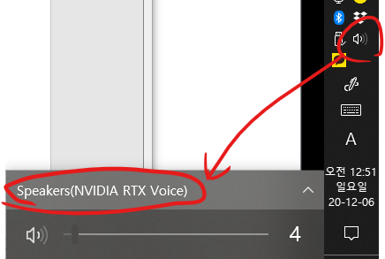 이것저것 세팅을 건드려보다가 되는 조합을 찾았는데 알고보니 이것도 저번 글에서의 Equalizer APO처럼 가상의 드라이버를 만들고 라우팅하는 것이었다. 최종 output은 NVIDIA RTX Voice로 놓고, 트레이에서 RTX voice 설정창을 켜고 기존에 쓰던 스피커를 RTX Voice로 송출하게 설정하면 된다. 잘 모르겠는 사람들은 아래 그림을 참고하자