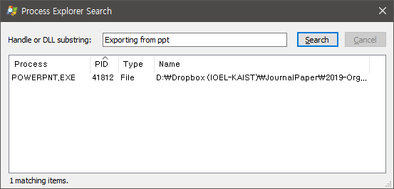 여기에 문제가 생긴 파일명의 일부를 적는다. 본인은 Exporting from ppt 라는 폴더가 문제가 있었기 때문에 그걸 넣고 서치를 눌렀다. 약간의 시간이 걸리면 무슨 프로그램이 쓰고 있는지 아래와 같이 찾아준다.