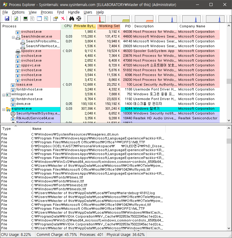 procexp64.exe를 마우스 우클릭을 해서 관리자 권한으로 실행한다. 그러면 아래와 같이 복잡한 창이 뜰 것이다. 당황할 필요 없고, 그냥 윈도우 기본 작업관리자보다 훨씬 자세히 보여준다고 생각하면 된다.