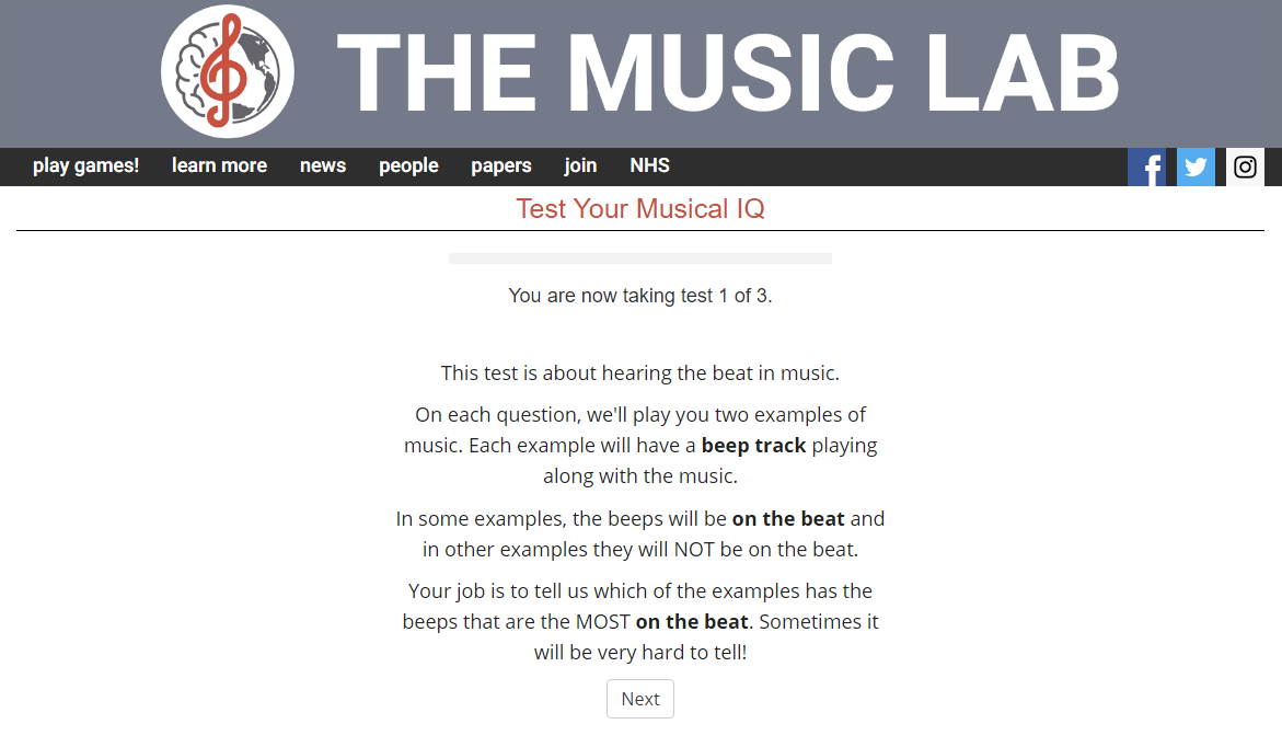 하버드 심리학과의 인지심리학 연구실인 Music Lab 이라는 곳에서 만든 테스트다. 테스트 시간은 꽤 걸리고(한 30~40분 정도?), 나는 조용한 방에서 테스트를 진행했다.