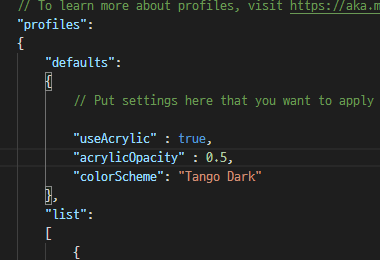 미세 팁: 윈도우 터미널에서 반투명 하고싶으면 아래와 같이 구성해 준다. 기본값은 불투명인데 아래와 같이 useAcrylic과 acrylicOpacity를 넣어주면 저장하는 즉시 반투명으로 바뀐다. 일반적인 투명도 조절과는 달리 뿌연 투명이라 더 멋있다.