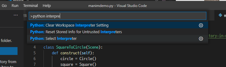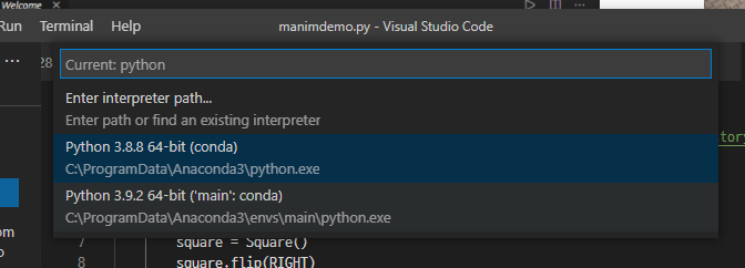 vscode를 켠 후 Ctrl + Shift + P 를 누르고 python interpreter라고 검색하면 다음과 같이 나온다.