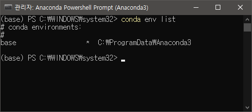 아나콘다 콘솔에서 다음을 입력한다. 기본으로 깔아주는 base라는 이름의 virtual env가 표시된다.