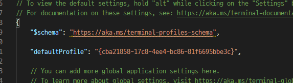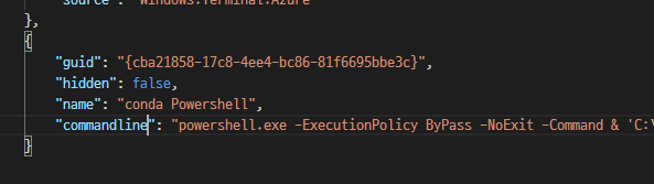 9. 마지막으로 윈도 터미널 세팅에서 defaultProfile 이라고 된 부분에 conda virtual env용으로 만든 guid를 넣는다.