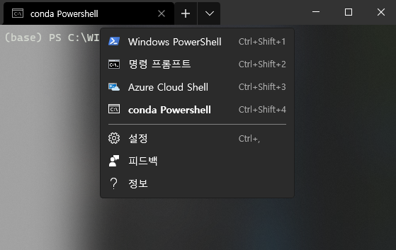- 윈도 터미널에도 conda shell을 연동해 주었다.