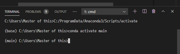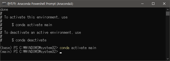 기본 실행환경을 base가 아니라 앞에서 생성한걸로 바꿔주기 위해 다음을 입력한다. 그러면 이제 아나콘다 콘솔 앞에 붙는 이름이 (main) 으로 변경된다.