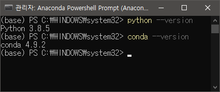 터미널 옆에 (base)라고 표시가 된다. 아나콘다 설치시 기본으로 주어지는 virtual env 이름이 base인데, 이게 보이는 것. 만약 윈도우 터미널을 켜서 python과 anaconda 버전을 확인했다면 설치시에 path 등록을 안했기 때문에 python 버전은 제대로 안나오고, conda 버전을 조회하면 에러가 난다.