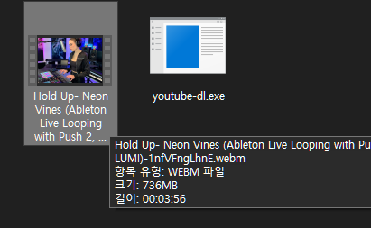 그러면 자기가 알아서 다운로드를 수행한다. 결과물은 기본적으로 youtube-dl이 있는 폴더에 저장된다. 참고로 터미널에서 y만 누르고 tab을 누르면 y로 시작하는 youtube-dl이 자동완성이 된다. 파일이 여러개인 경우 tab을 여러 번 누르면 다른 파일도 선택할 수 있다. 그리고 웹 주소의 경우도 Powershell의 경우 Ctrl +V를 지원하지만 가끔 안되는 터미널들이 있다. 이 경우 빈 공간에 마우스 우클릭을 하면 자동으로 붙여넣기가 된다. 나는 Ctrl + V 보다 이게 더 편해서 자주 쓰고 있다.
