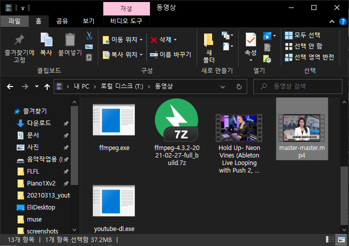 1. ffmpeg를 다운받은 후 같은폴더에 복사한다든지 해서 youtube-dl이 인식할 수 있게 한다.
